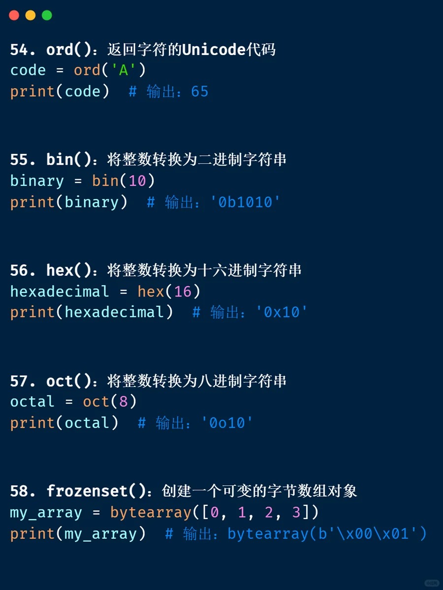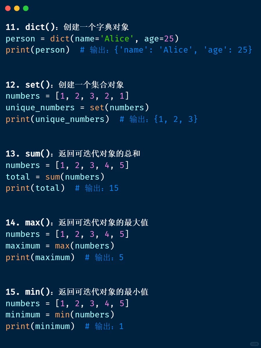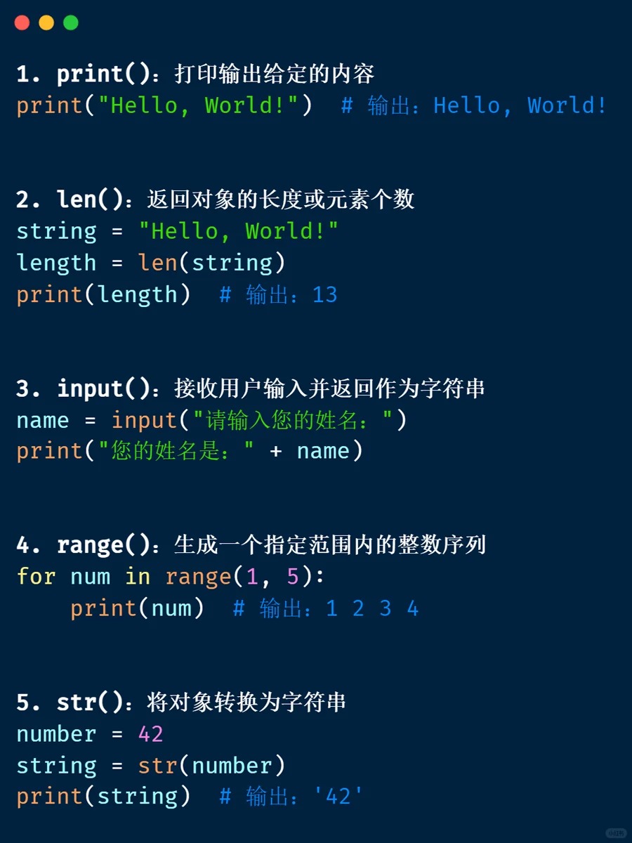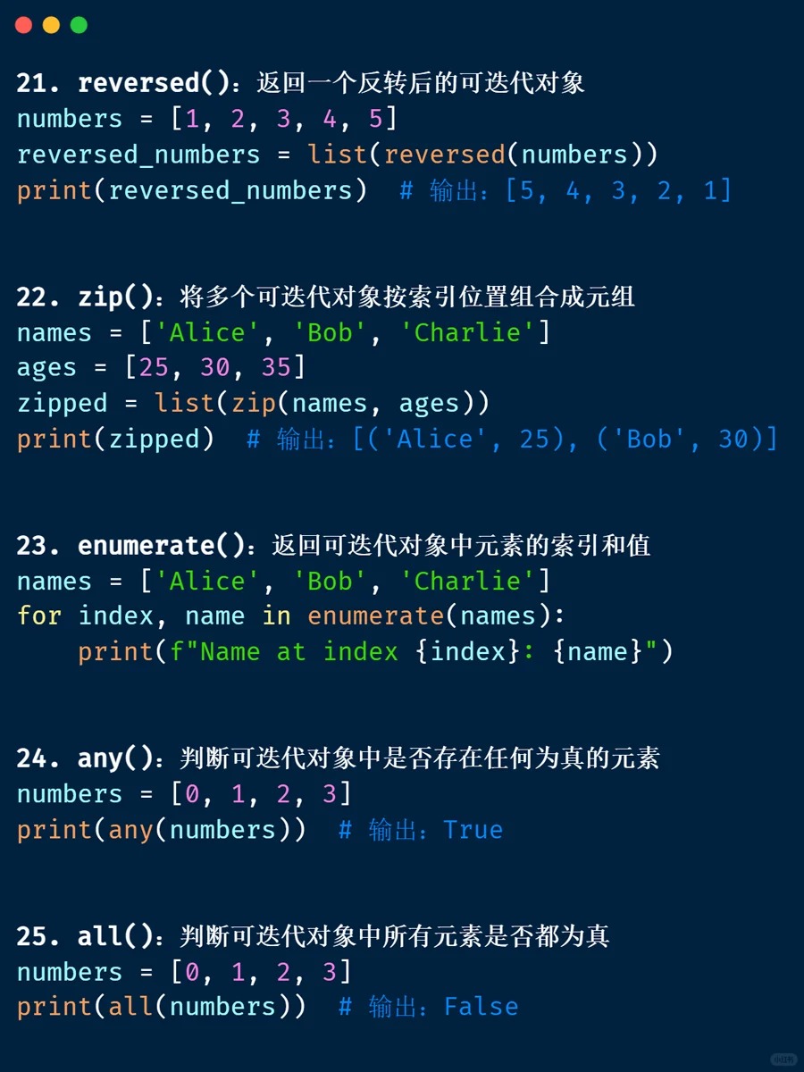 内置函数 📁 <Category 7> 📅 2026-04-04 13:39:53 👁️ 1 次阅读 <Tag 56> 📑 目录 📖 正文内容 💡 示例代码 💭 技巧提示 📚 参考资料 📖 正文内容 内置函数abs()divmod()input()open()staticmethod()all()enumerate()int()ord()str()any()eval()isinstance()pow()sum()basestring()execfile()issubclass()print()super()bin()file()iter()property()tuple()bool()filter()len()range()type()bytearray()float()list()raw_input()unichr()callable()format()locals()reduce()unicode()chr()frozenset()long()reload()vars()classmethod()getattr()map()repr()xrange()cmp()globals()max()reverse()zip()compile()hasattr()memoryview()round()__import__()complex()hash()min()set()delattr()help()next()setattr()dict()hex()object()slice()dir()id()oct()sorted()exec 内置表达式 💡 示例代码 💭 技巧提示 💡 📚 参考资料 🔗 相关文章 暂无相关文章