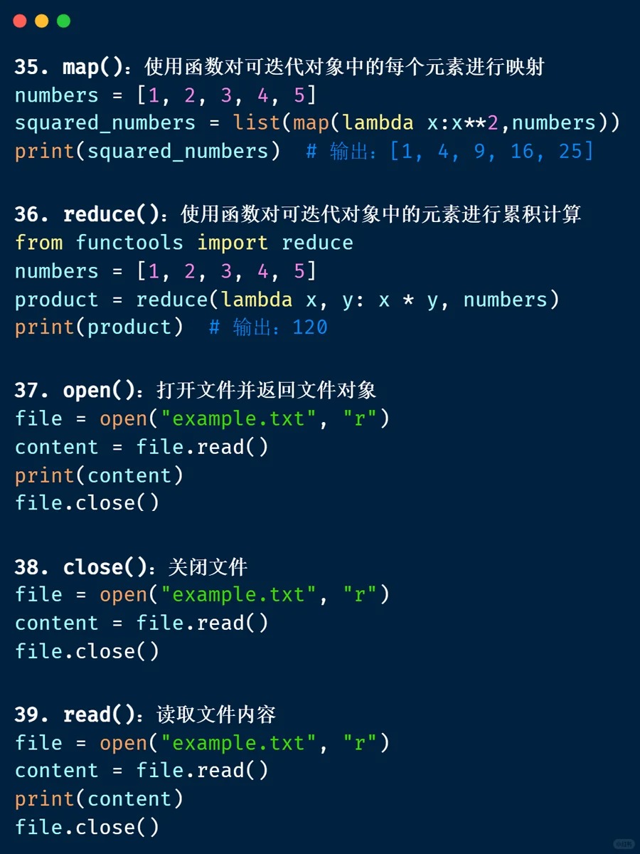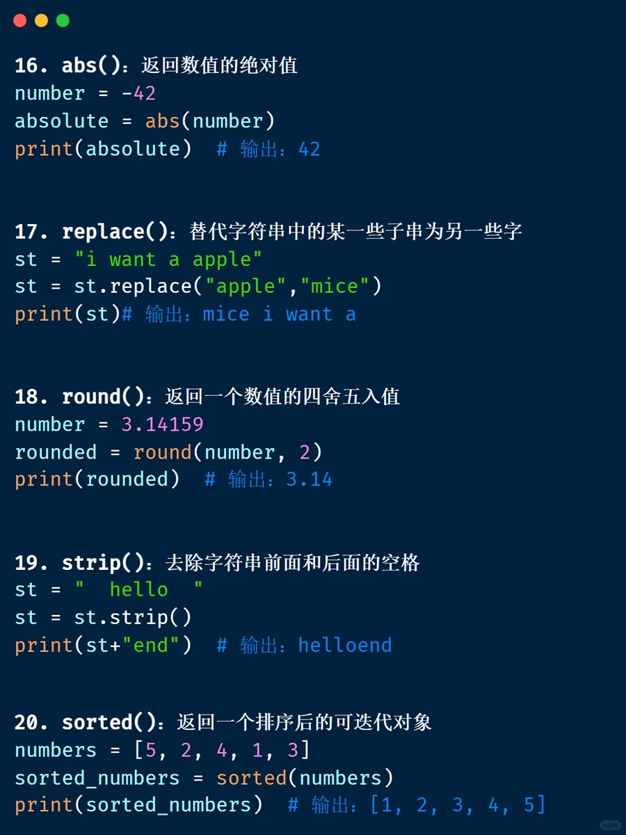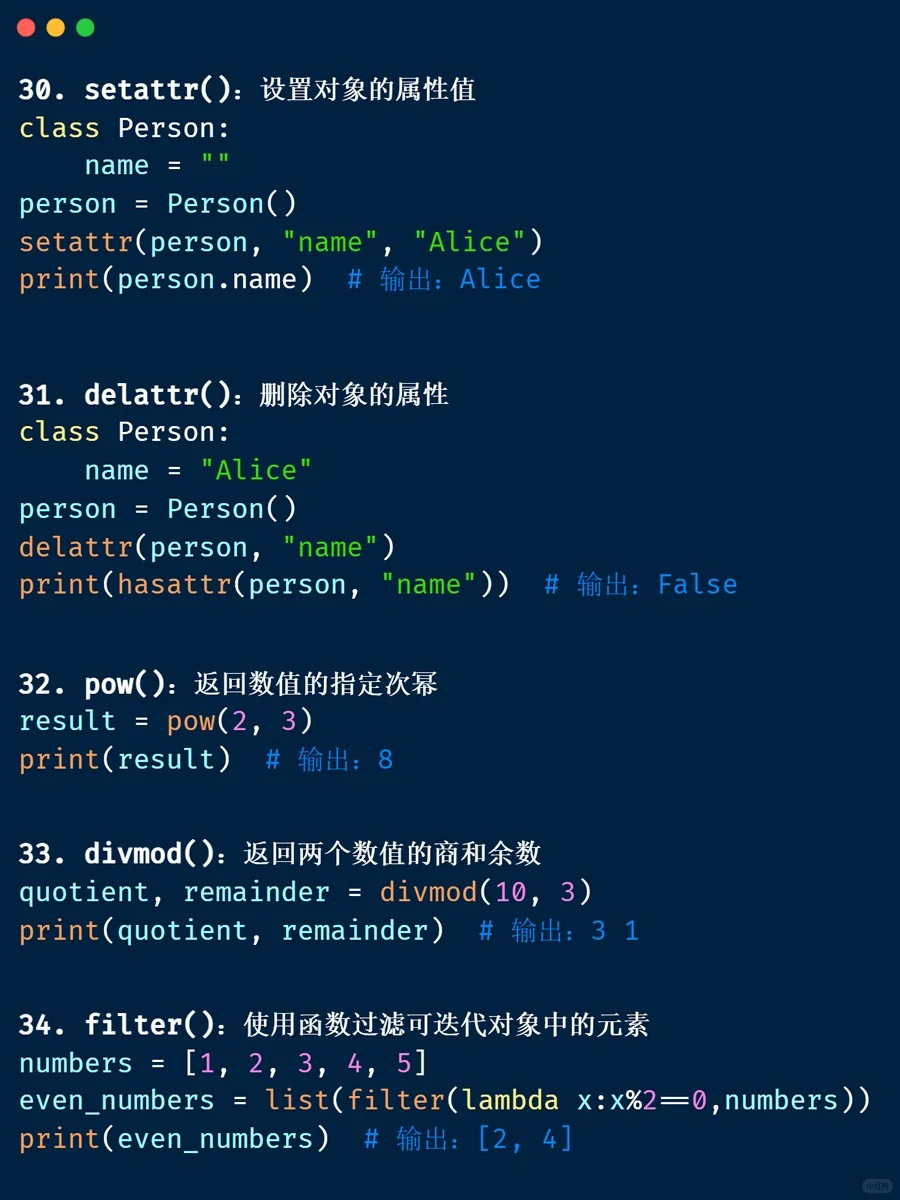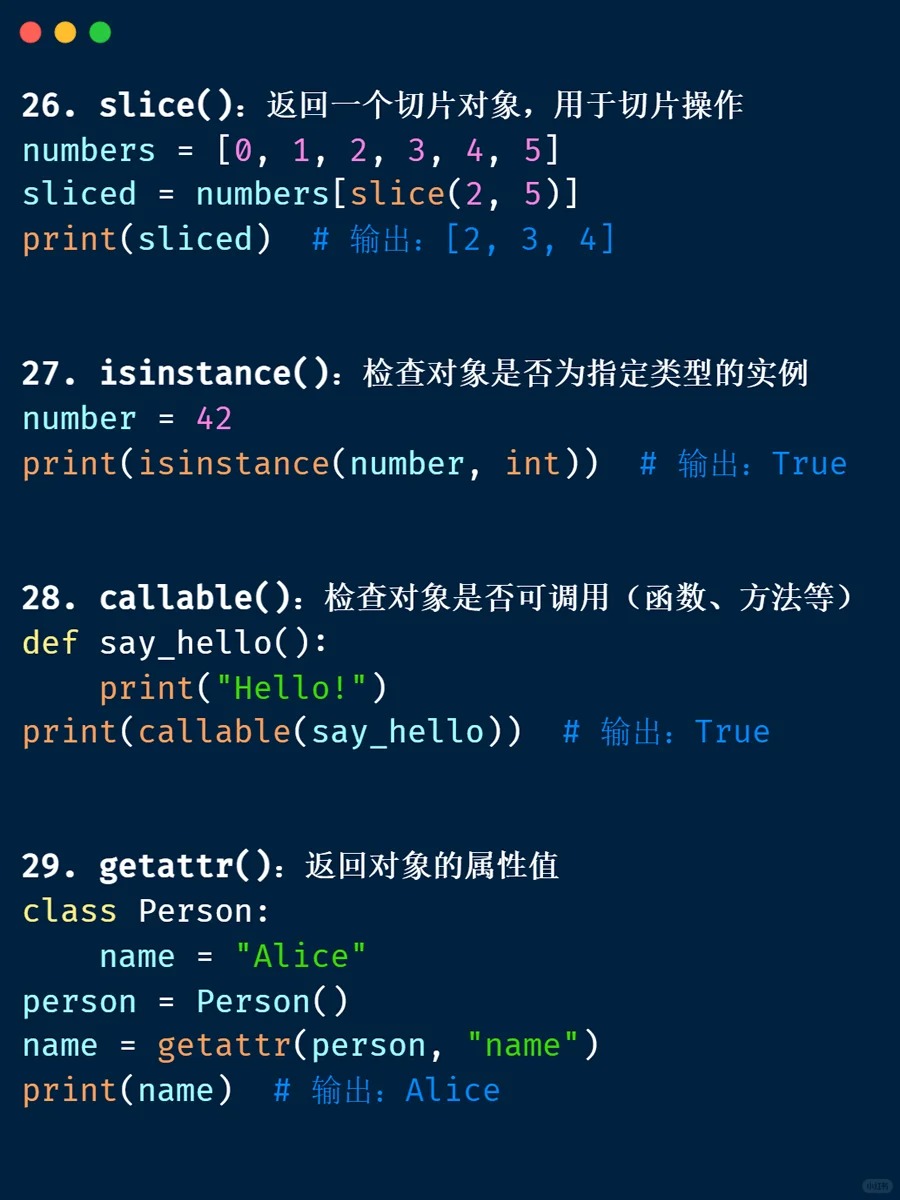 内置函数 📁 <Category 7> 📅 2026-04-04 13:39:53 👁️ 1 次阅读 <Tag 56> 📑 目录 📖 正文内容 💡 示例代码 💭 技巧提示 📚 参考资料 📖 正文内容 内置函数abs()divmod()input()open()staticmethod()all()enumerate()int()ord()str()any()eval()isinstance()pow()sum()basestring()execfile()issubclass()print()super()bin()file()iter()property()tuple()bool()filter()len()range()type()bytearray()float()list()raw_input()unichr()callable()format()locals()reduce()unicode()chr()frozenset()long()reload()vars()classmethod()getattr()map()repr()xrange()cmp()globals()max()reverse()zip()compile()hasattr()memoryview()round()__import__()complex()hash()min()set()delattr()help()next()setattr()dict()hex()object()slice()dir()id()oct()sorted()exec 内置表达式 💡 示例代码 💭 技巧提示 💡 📚 参考资料 🔗 相关文章 暂无相关文章
